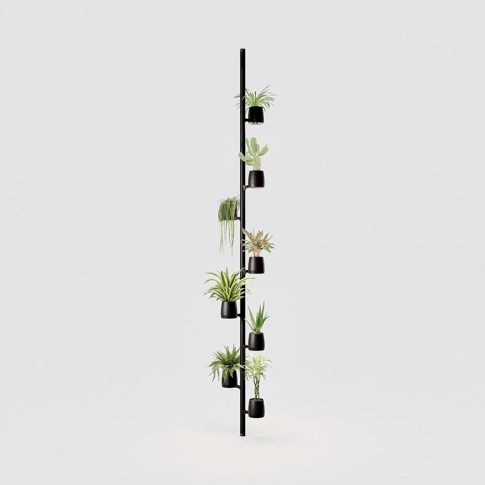 The Single set fits between floor and ceiling up to 2.70 m. With the Extended version you can go up to 3.60 m. Thanks to the strong and movable mounting system, you decide where the 8 included PlantPods and 8 LightPads go.