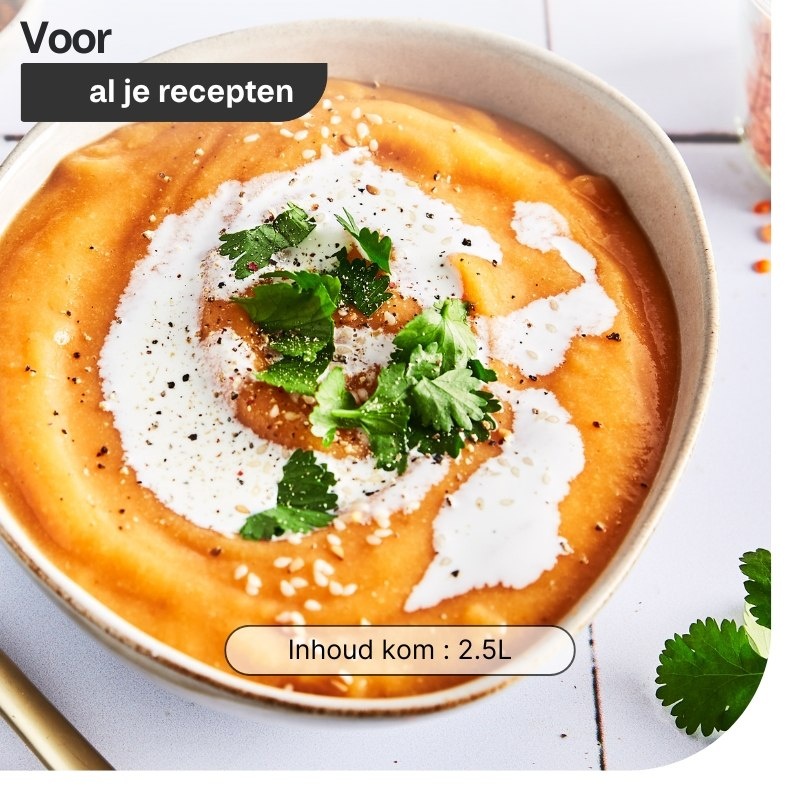 Standaard in de doos: Glazen kom, mengspatel/ stamper, dooserdop en receptenboek.